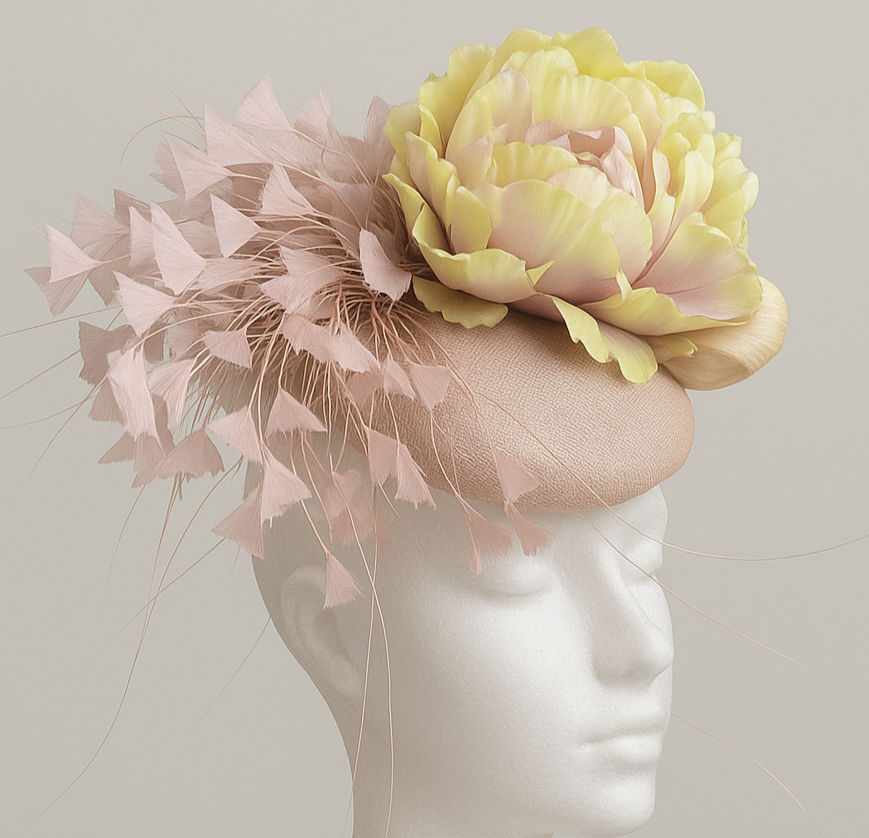 F5 -Blush-Pink Fascinator Hat with Peony & Feather Detail